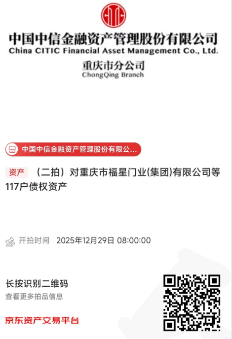 中國中信金融資產(chǎn)管理股份有限公司重慶市分公司(以下簡稱我分公司)擁有對重慶市福星門業(yè)(集團)有限公司等117戶不良債權(quán)資產(chǎn)。我分公司將于2025年12月29日8:00至2025年12月30日17:30止在京東拍賣網(wǎng)通過公開競價方式進行處置,拍賣鏈接如下圖所示,現(xiàn)予以公告。